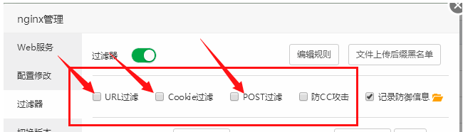 如果 URL过滤、POST过滤、防CC攻击开启的话就要都关闭掉。尝试关闭后问题解决。